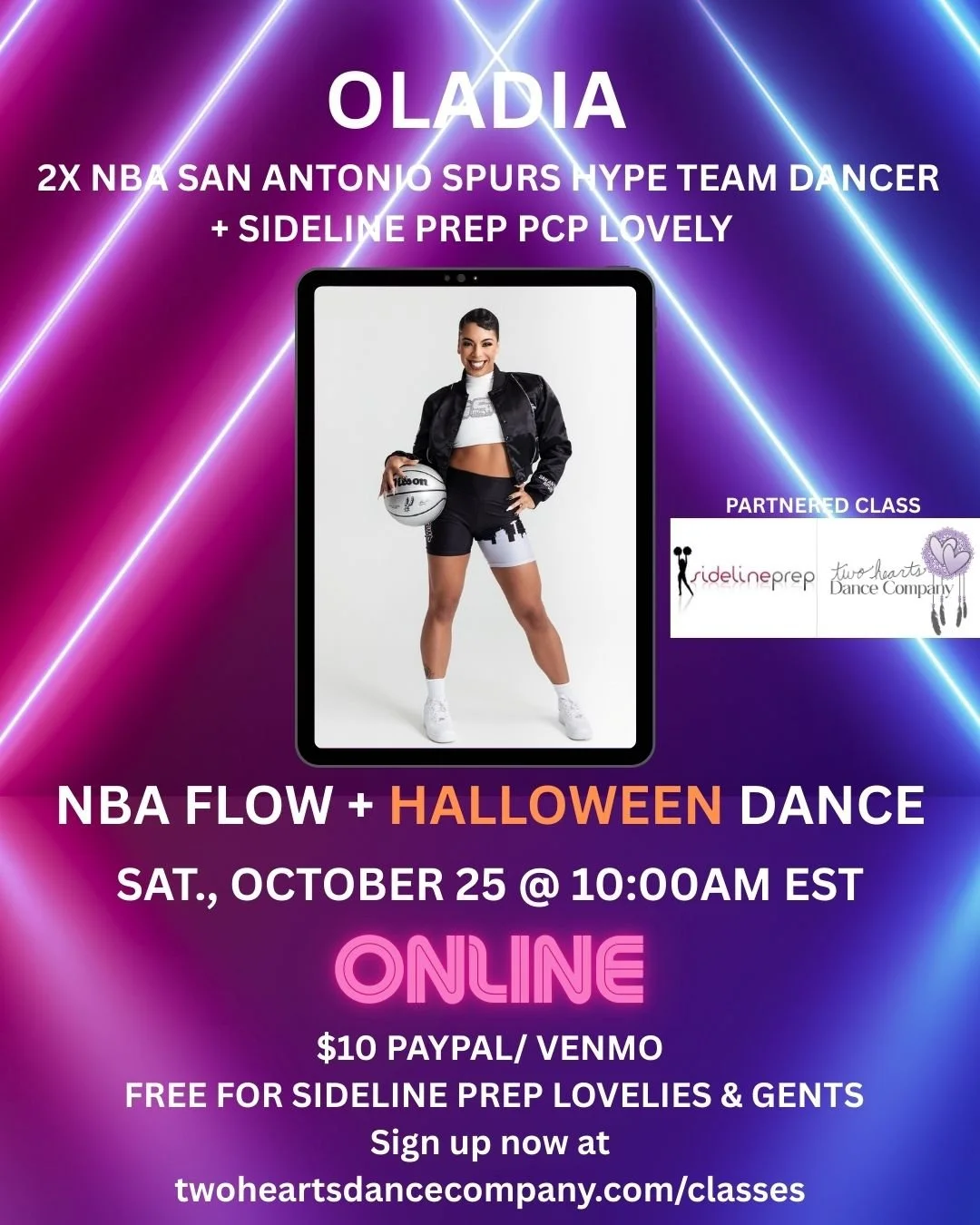 October: NBA Flow + HALLOWEEN Dance w/ Oladia on Saturday, October 25 at 10:00am EST, Online Class — Oladia is a 2x NBA San Antonio Spurs Hype Squad Dancer (follow @artisticallyla to learn more about her) and a Sideline Prep PCP Graduate. This is a Two Hearts Dance Company + Sideline Prep partnered class. All are welcome!