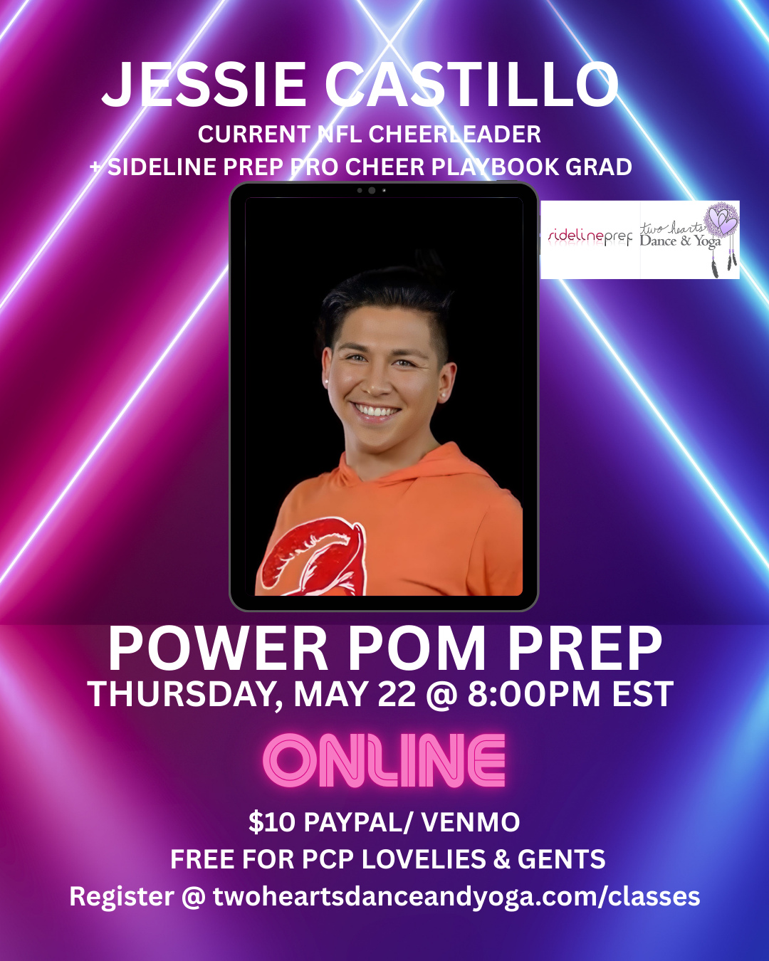 Join this virtual class w/ Jessie Castillo, Thursday, May 22 at 8:00pm EST, a Two Hearts Dance & Yoga + Sideline Prep collaborative class. Jessie is a current NFL Cheerleader and a Sideline Prep PCP Graduate. Join Jessie in a fun, jazz funk, and pom fusion as we learn pro style movement to train you for your next audition or just coming out of your comfort zone! Jessie looks forward to training with you!