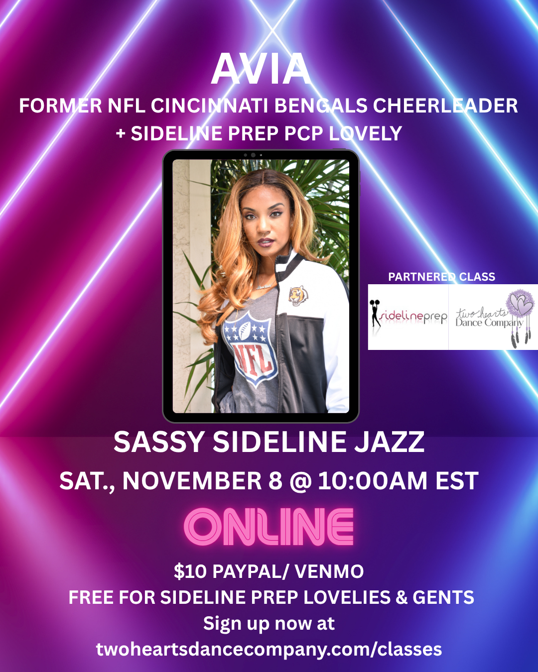 November: Sassy Sideline Jazz w/ Avia, Sat. November 8 at 10:00am EST Online — Avia is a Cincinnati Bengals Cheerleader and Miami Marlins Mermaid (follow @avia__ciera) to learn more about her). This is a Two Hearts Dance Company + Sideline Prep partnered class. All are welcome!